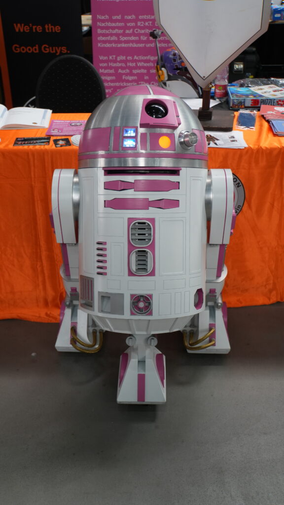 Droid-builders were also present.  “Girl-2-D2” stood sentinel in front of her maker’s information stand, making chirping sounds occasionally.  No effort was expended to offer interpretation of the chirps, but we assumed that they were just friendly banter.  But who knows?  Maybe the chirping was actually digital flirting directed at the bedazzled Storm Trooper?